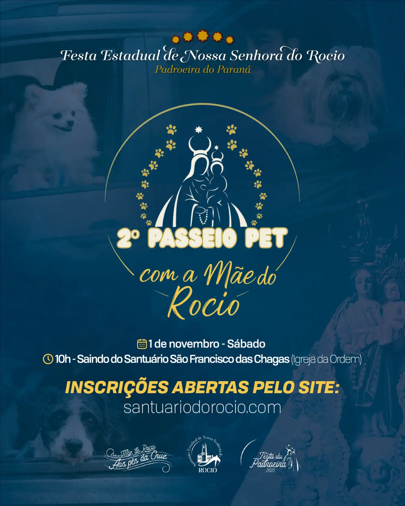 O Santuário Estadual de Nossa Senhora do Rocio realiza neste sábado, 1.º de novembro, a partir das 10h, o 2º Passeio Pet com a Mãe do Rocio, uma das atividades mais aguardadas da programação religiosa e cultural em homenagem à Padroeira do Paraná.