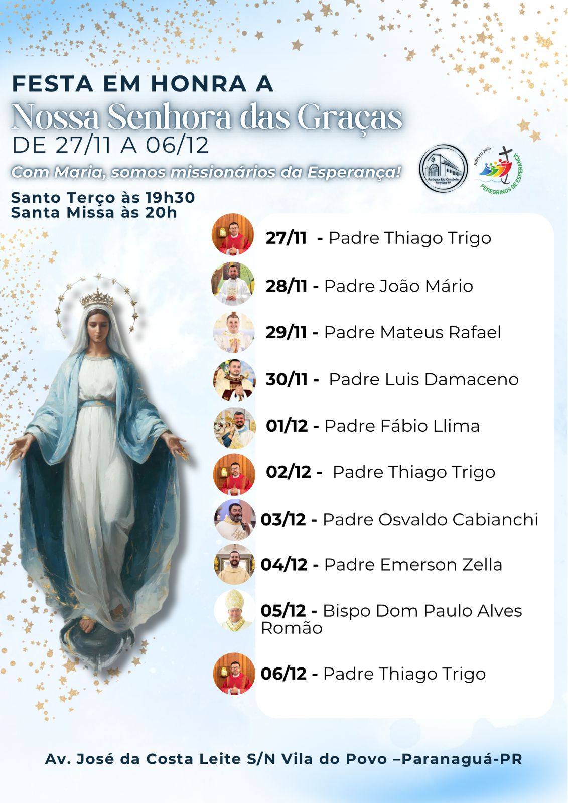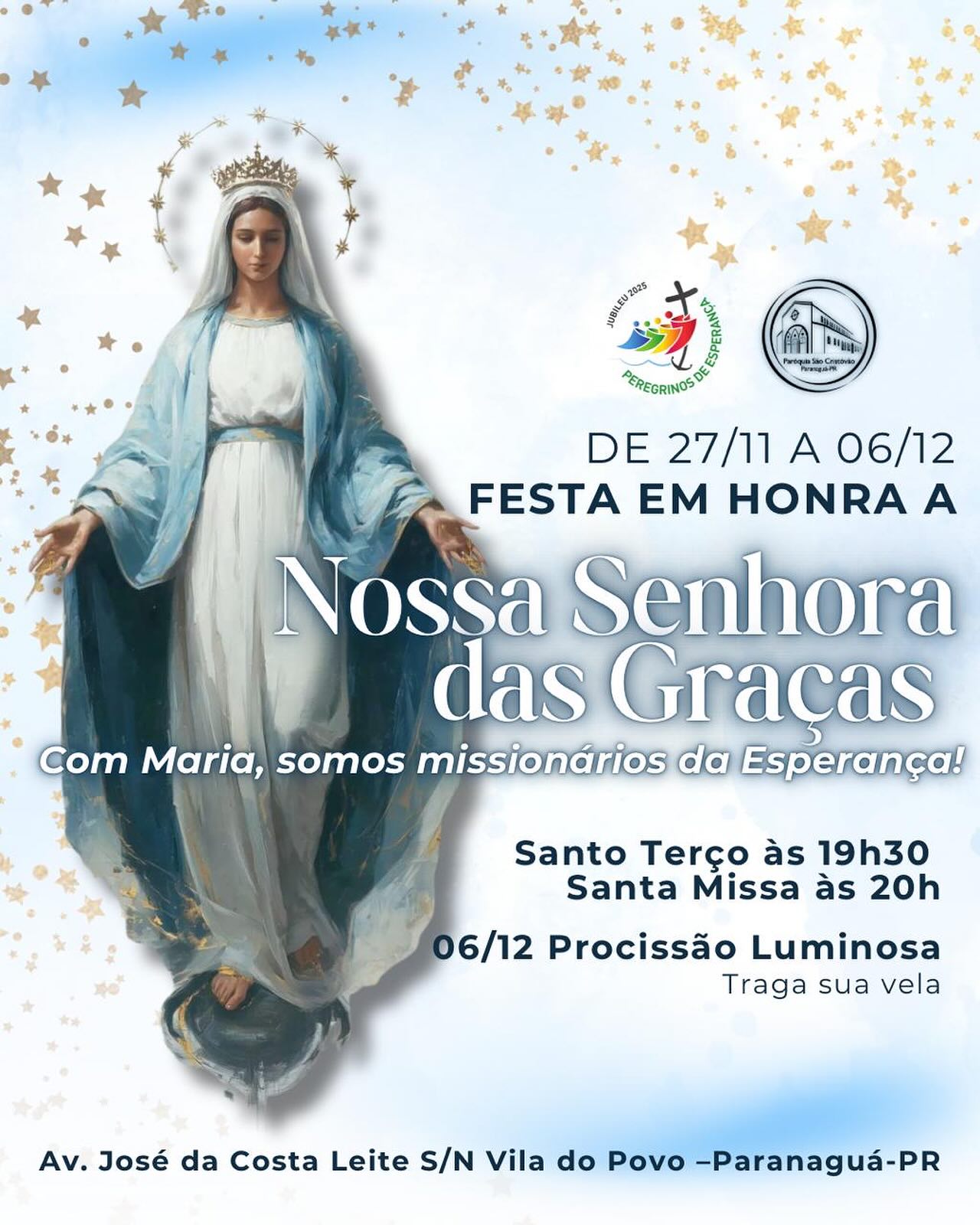 A comunidade da Vila do Povo, em Paranaguá, inicia nesta quinta-feira (27/11) a tradicional festa em honra a Nossa Senhora das Graças. A programação segue até o dia 6 de dezembro, reunindo fé, devoção e intensa participação da comunidade.