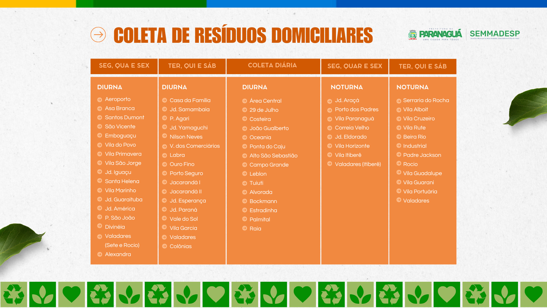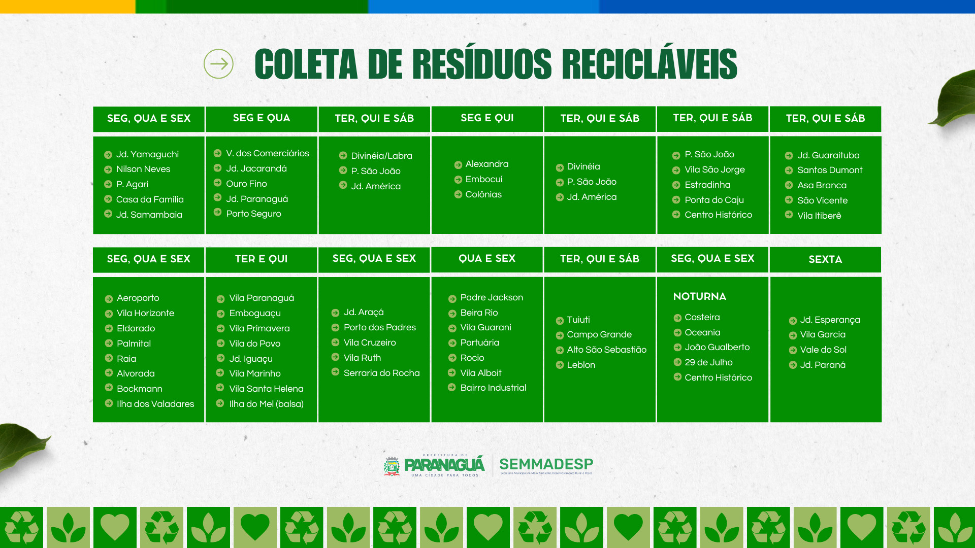 Já a coleta de materiais recicláveis ocorre de segunda a sábado, abrangendo todas as regiões de Paranaguá. O cronograma inclui bairros como Jardim Yamaguchi, Nilson Neves, Casa da Família, Jardim Samambaia, Vila Horizonte, Jardim Eldorado, Emboguaçu, Vila Garcia, Vale do Sol, Alexandra e Ilha dos Valadares — com horários distintos para os períodos diurno e noturno.
