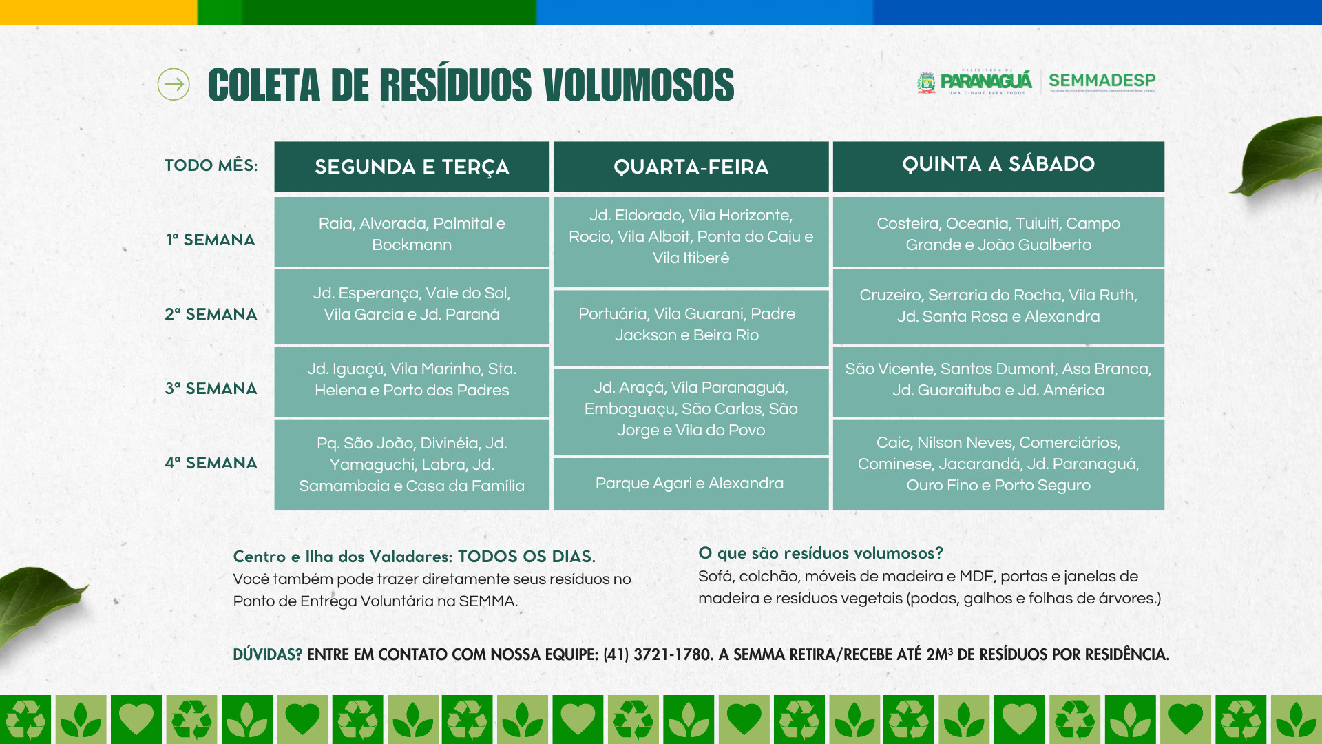 A Semmadesp também mantém o serviço de coleta de resíduos volumosos, que abrange materiais como sofás, colchões, móveis de madeira e MDF, portas, janelas e resíduos vegetais (galhos, folhas e podas). A retirada é feita conforme o cronograma semanal, com atendimento de segunda a sábado em diferentes regiões.