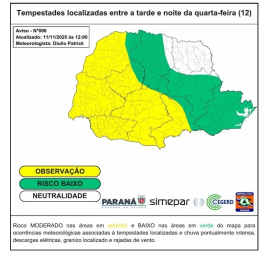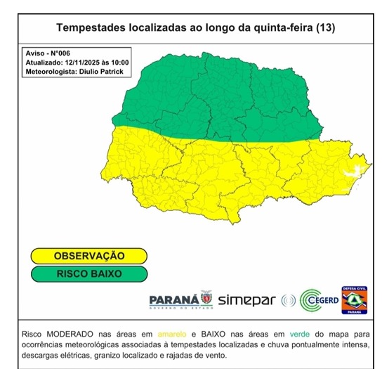 A Coordenadoria Estadual da Defesa Civil do Paraná divulgou, nesta quarta-feira (12), o Boletim de Gestão de Riscos nº 006/2025, atualizado com informações do SIMEPAR. O documento aponta a formação de um sistema de baixa pressão atmosférica entre o norte da Argentina e o Paraguai, o que deve provocar mudanças no tempo em diversas regiões do estado.
