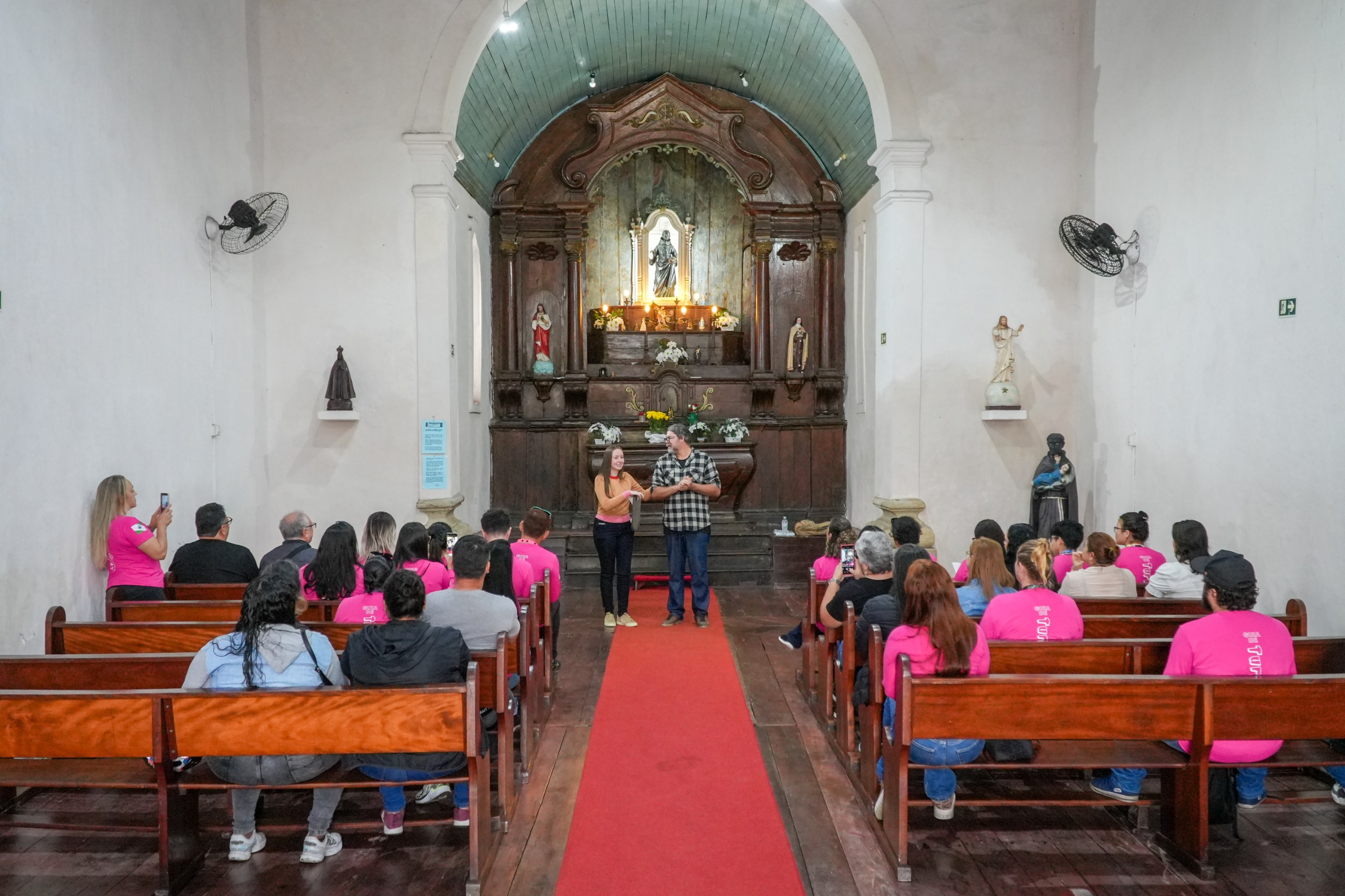 Na sequência, a mediação ficou a cargo do professor, ator e historiador Deni Capetta, que relatou curiosidades e explanou sobre a diversidade cultural e a riqueza dos objetos da igreja.