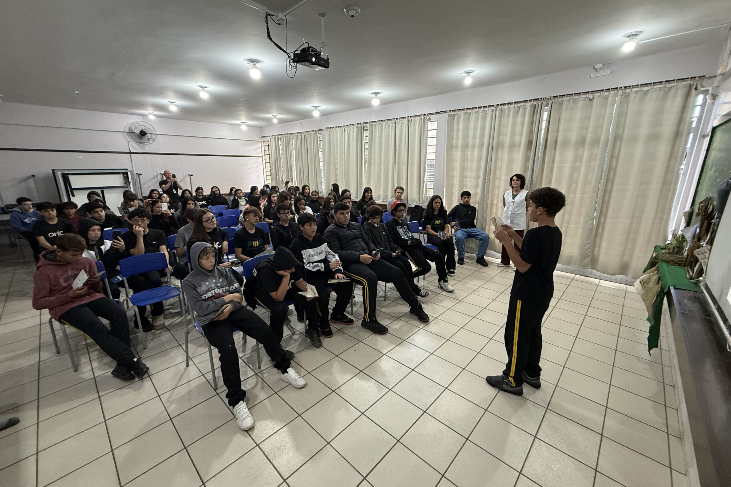 Durante a atividade de escrita criativa, o aluno Leonardo Henrique Urbaneck do Carmo, do 7º ano E, apresentou um texto inspirado na rota histórica e foi aplaudido pelos colegas e convidados.