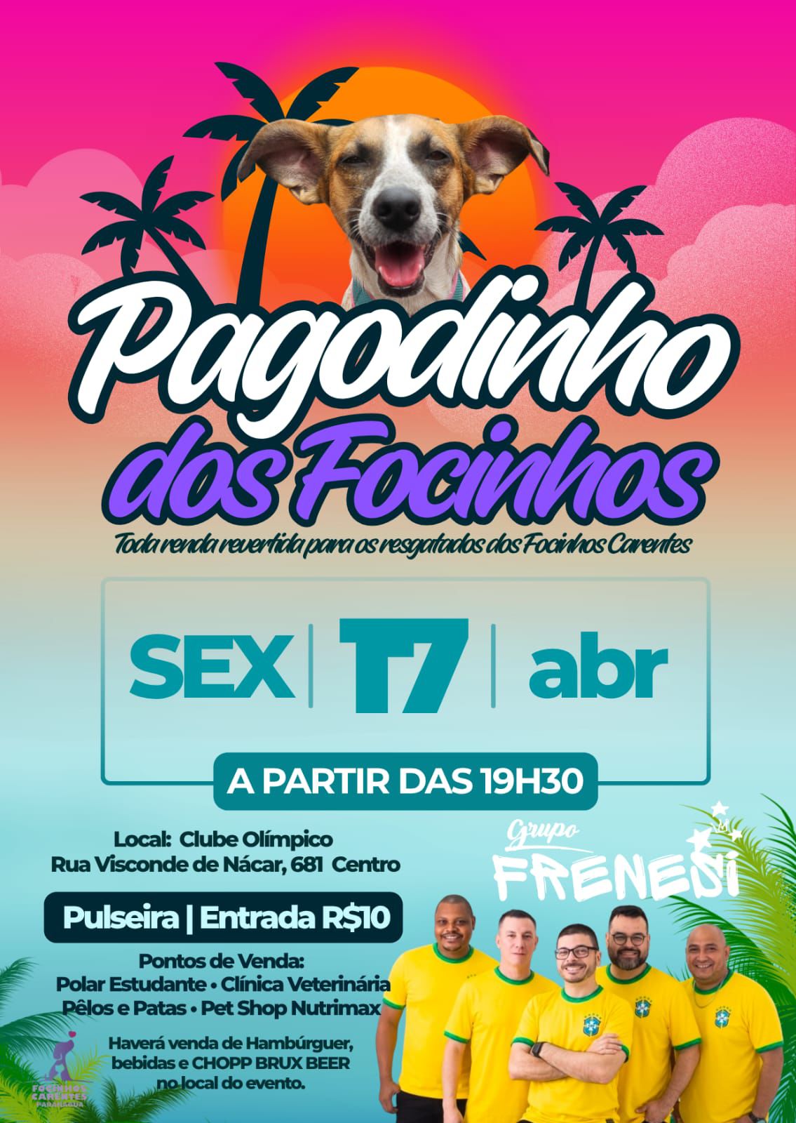 A ONG Focinhos Carentes realiza, nesta sexta-feira (17), mais uma edição do “Pagodinho dos Focinhos”, evento beneficente que tem como objetivo arrecadar recursos para a manutenção e cuidados de animais resgatados em Paranaguá. A programação começa a partir das 19h30, no Clube Olímpico, localizado na Rua Visconde de Nácar, nº 681, no Centro.