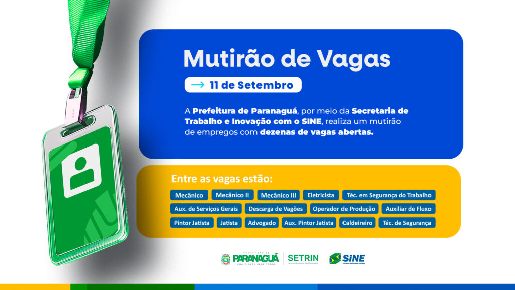 A Agência do Trabalhador de Paranaguá, em parceria com o SINE (Sistema Nacional de Empregos) e com apoio da Prefeitura, realiza nesta quinta-feira, 11 de setembro, um Feirão de Empregos para preencher mais de 100 vagas em empresas que ampliam suas atividades no município.