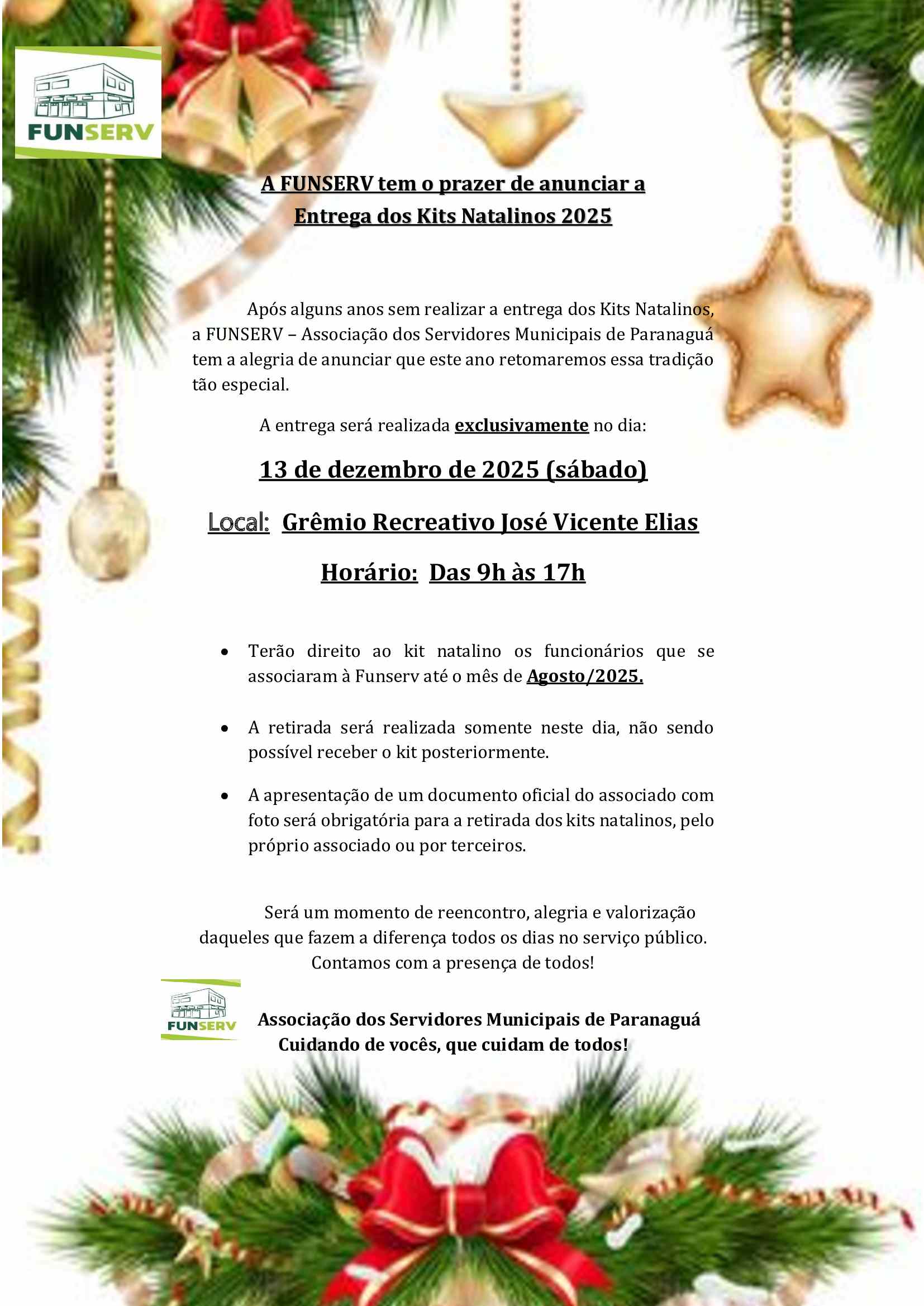 A Associação dos Servidores Municipais de Paranaguá (FUNSERV) divulgou duas importantes ações voltadas aos seus associados neste fim de ano: três sorteios especiais de Natal e a retomada da tradicional entrega dos Kits Natalinos.
