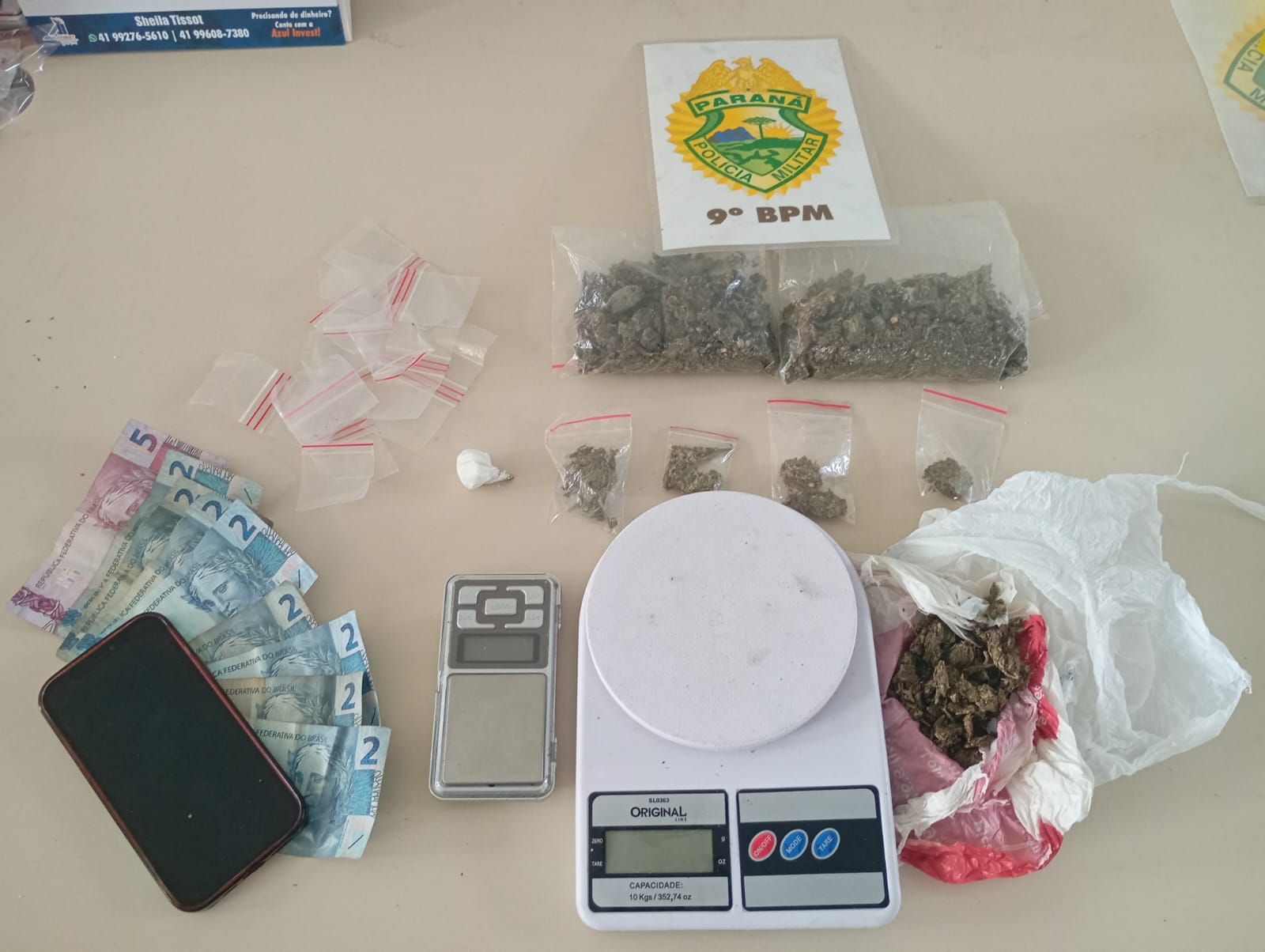 Durante patrulhamento pela Avenida Matinhos, policiais militares ouviram sons semelhantes a disparos de arma de fogo e, ao verificar a área, encontraram o suspeito que tentou fugir, mas foi detido. No local, foram apreendidos 156 gramas de maconha, 2,5 gramas de cocaína, duas balanças de precisão, R$ 21 em dinheiro e um celular.