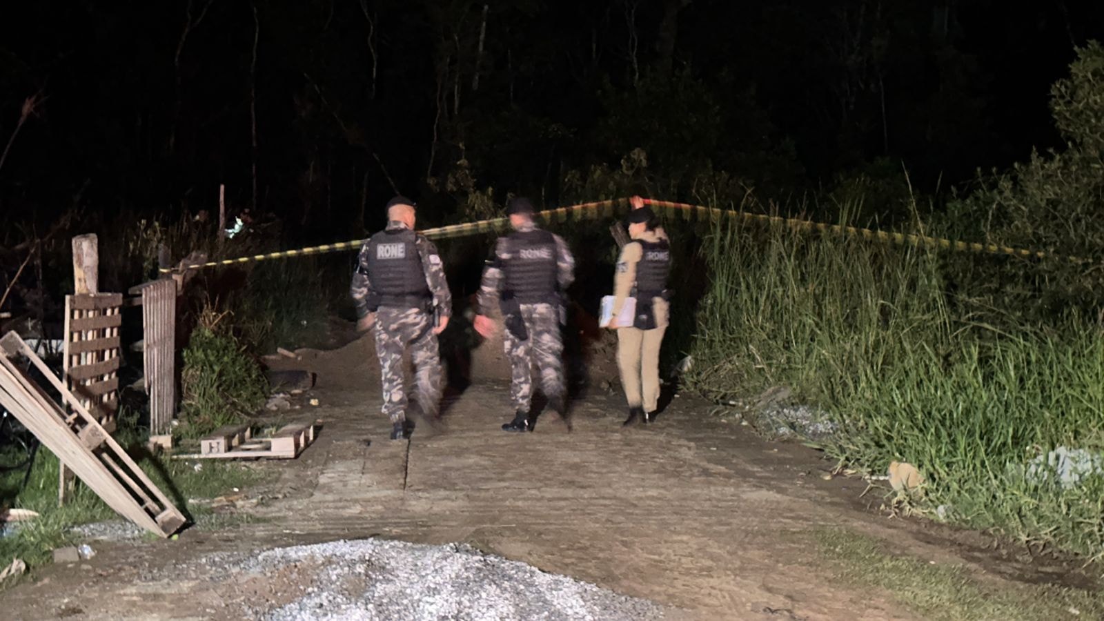 A área, que fica em uma região de pouca iluminação e próxima a uma área de mata, foi isolada para os trabalhos de perícia.