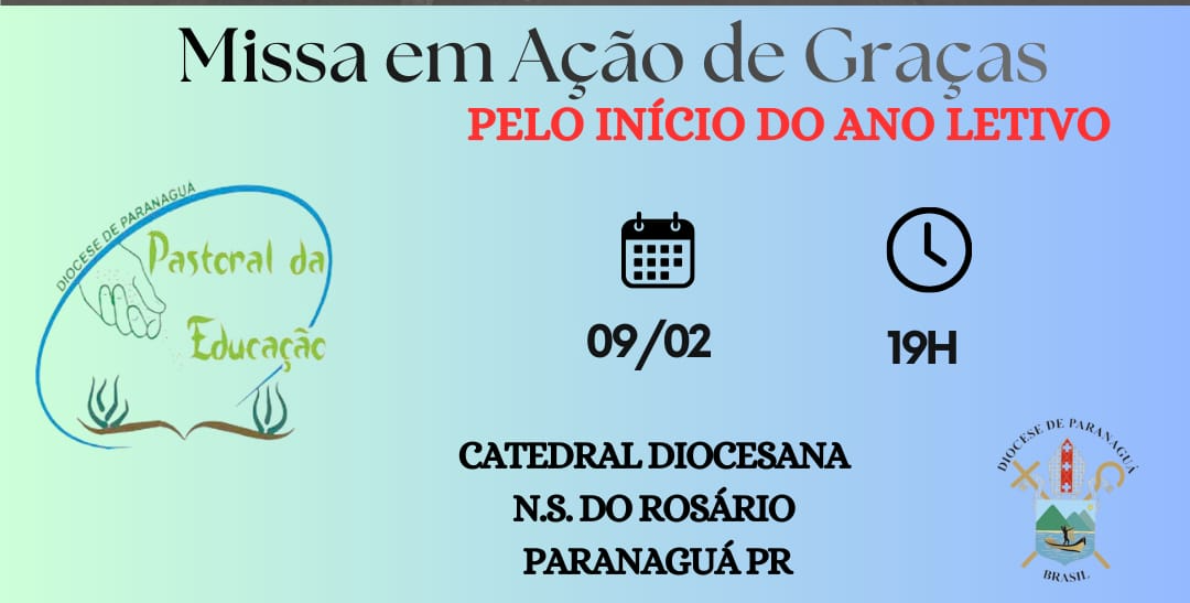 A Diocese de Paranaguá, por meio da Pastoral da Educação, promove na próxima segunda – feira dia 9 de fevereiro, às 19 horas, a Missa em Ação de Graças pelo início do ano letivo. A celebração será realizada na Catedral Diocesana Nossa Senhora do Rosário, em Paranaguá (PR).