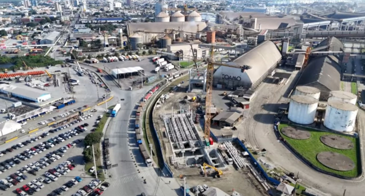 Um dos principais avanços foi a finalização da montagem dos pré-moldados da cobertura da moega. No mesmo local foram instaladas as grelhas metálicas no piso por onde passarão os produtos que sairão dos vagões. Das nove torres, sete já estão com a parte civil (concreto) concluída.