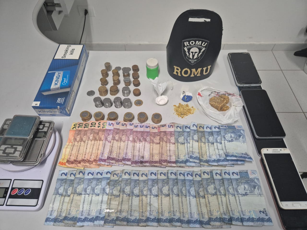 Na entrada da casa onde ocorreu a abordagem, foram localizados ainda um pacote fechado contendo dez maços de cigarros, quatro balanças de precisão (três da marca Minimen e uma da marca Facilite) e seis aparelhos celulares de diferentes marcas e modelos.