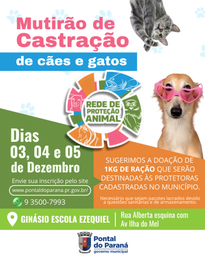 A Rede de Proteção Animal de Pontal do Paraná realizará mais um Mutirão de Castração de cães e gatos nos dias 03, 04 e 05 de Dezembro. A iniciativa visa o controle populacional de animais, priorizando cães e gatos de tutores em situação de vulnerabilidade social e animais resgatados das ruas.