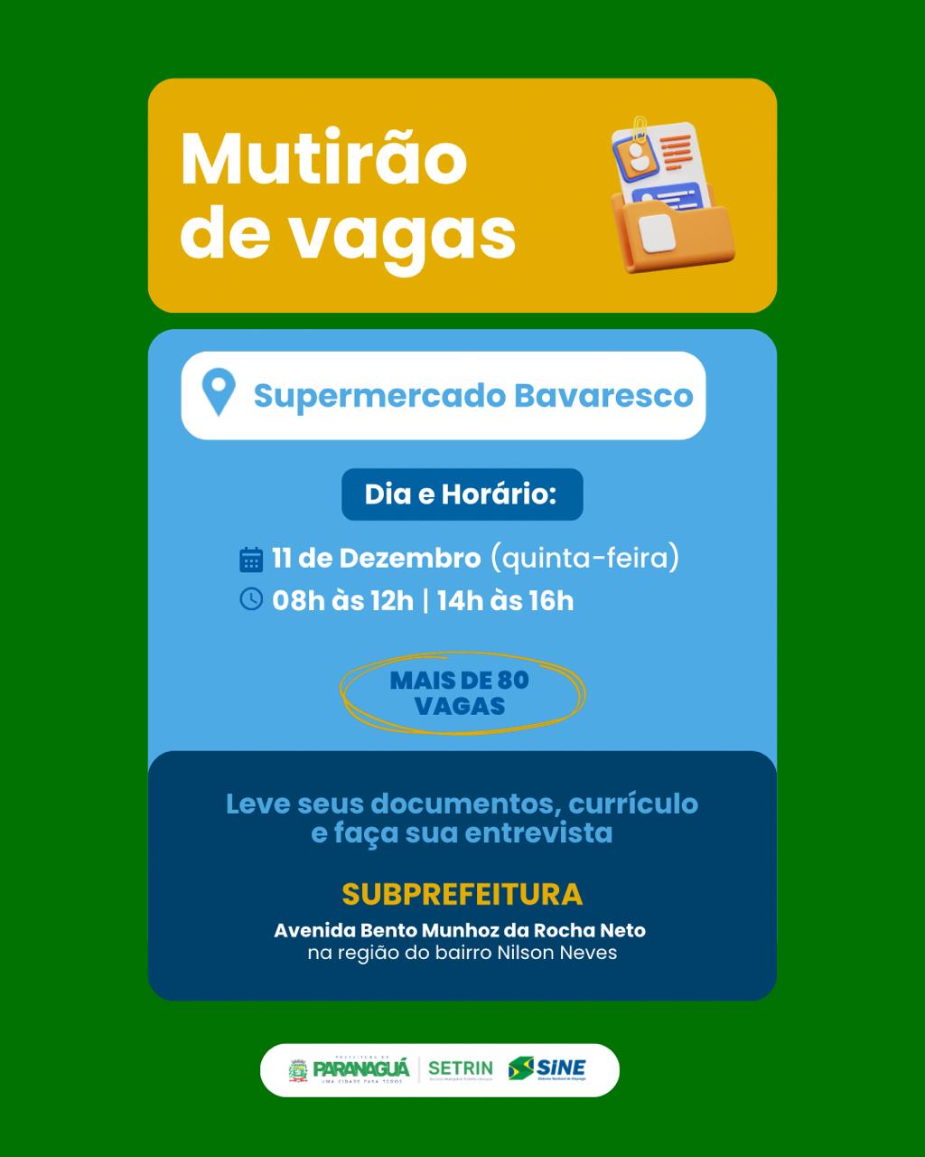 A Subprefeitura de Paranaguá recebe nesta quinta-feira, 11 de dezembro, um mutirão de vagas promovido em parceria com o SINE e o Supermercado Bavaresco. A ação reúne mais de 80 oportunidades de emprego, abrangendo diferentes áreas de atuação.