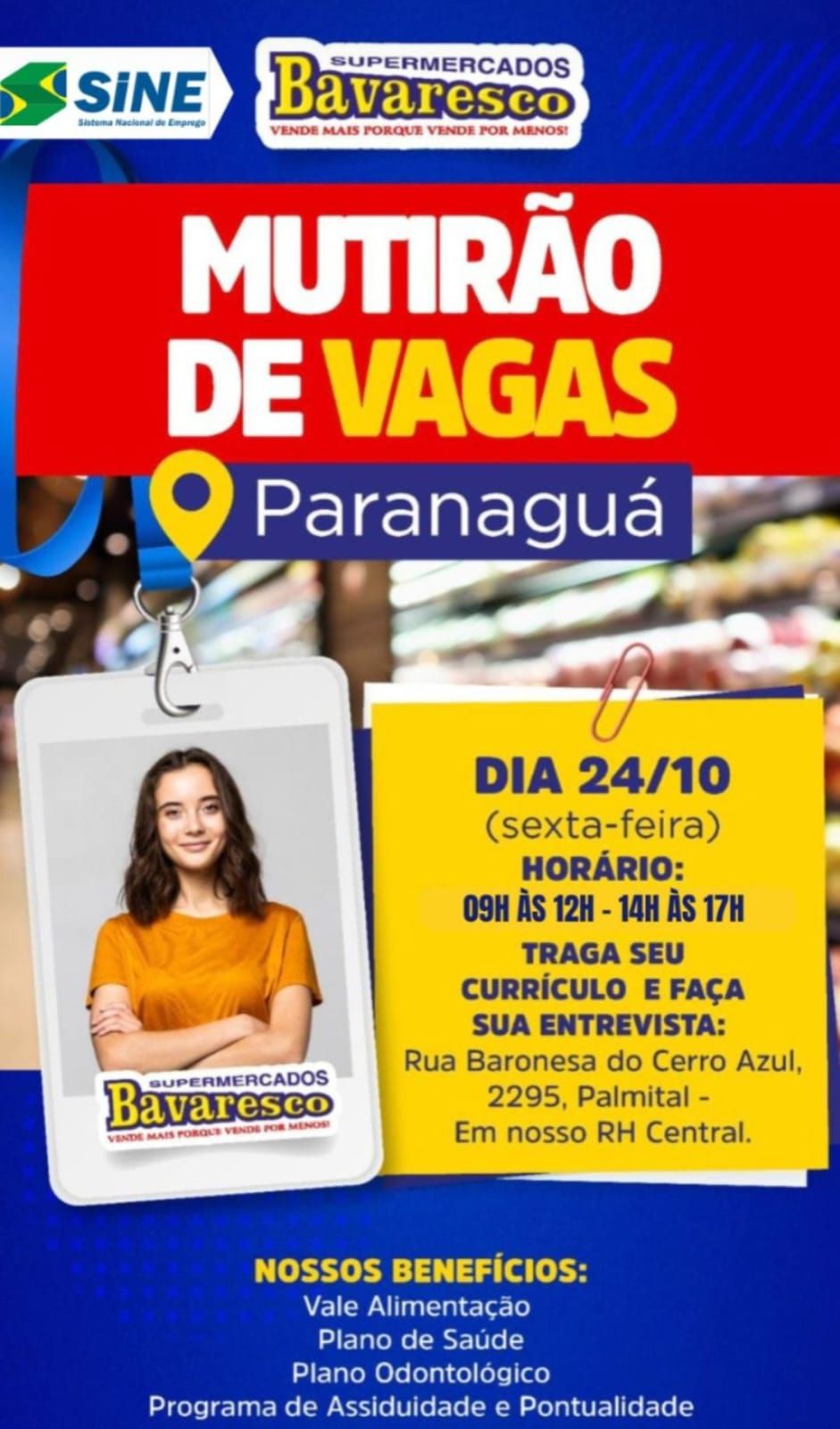 O Grupo Bavaresco, em parceria com o SINE Paranaguá, promove nesta sexta-feira (24) um mutirão de empregos com 50 oportunidades de trabalho para quem busca uma nova colocação no mercado.