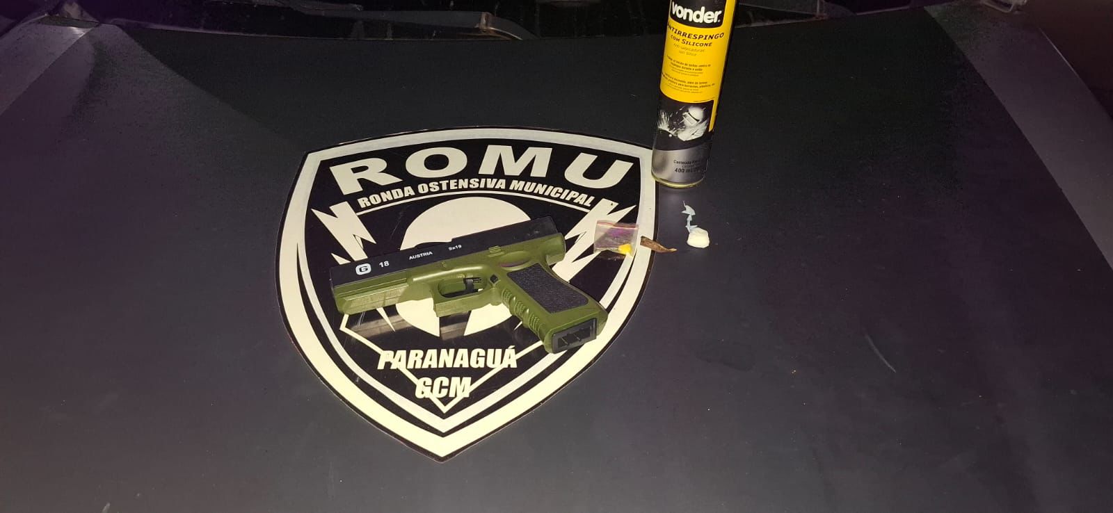 Durante buscas no estabelecimento, os agentes localizaram, atrás de um sofá, um simulacro de arma de fogo — uma réplica de pistola. Não foi possível identificar o proprietário do objeto.