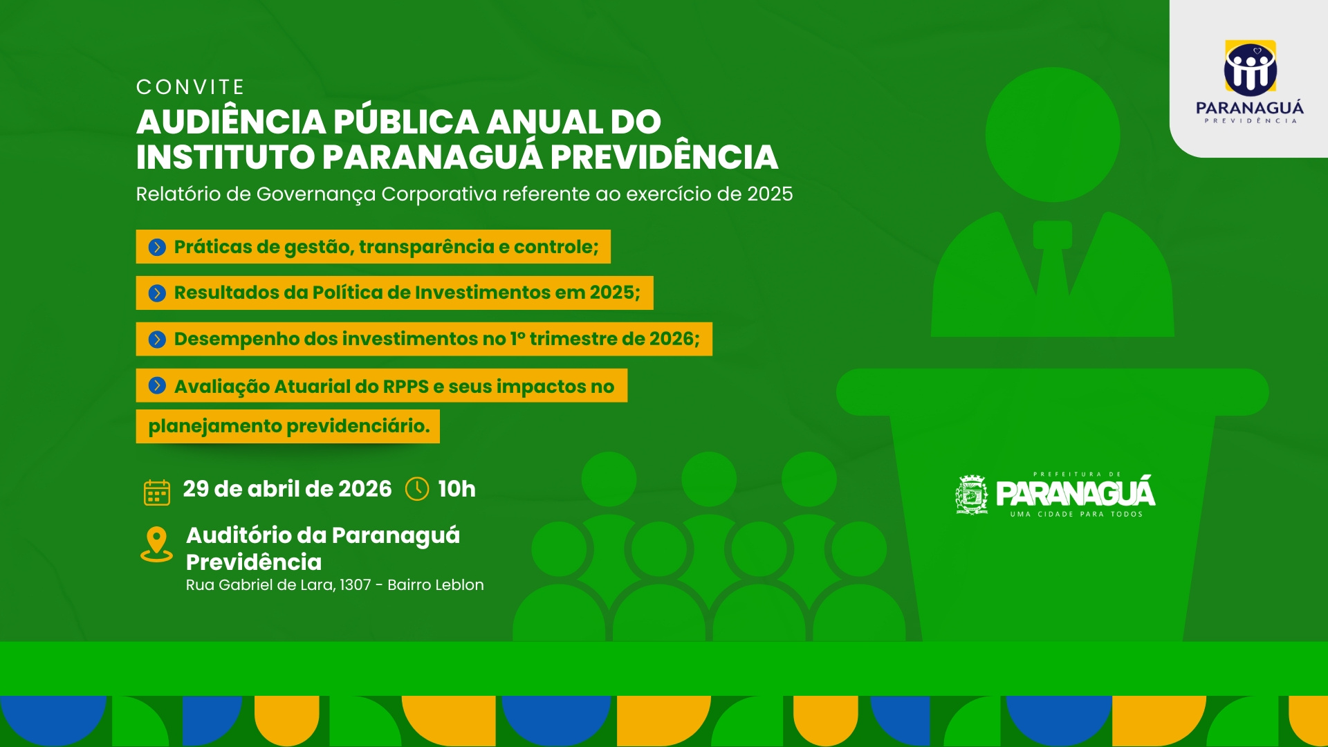O Paranaguá Previdência promove nesta terça-feira (29), às 10h, uma audiência pública aberta ao público em Paranaguá. O encontro tem como objetivo apresentar os resultados da gestão referentes ao ano de 2025 e reforçar a transparência na administração dos recursos previdenciários.