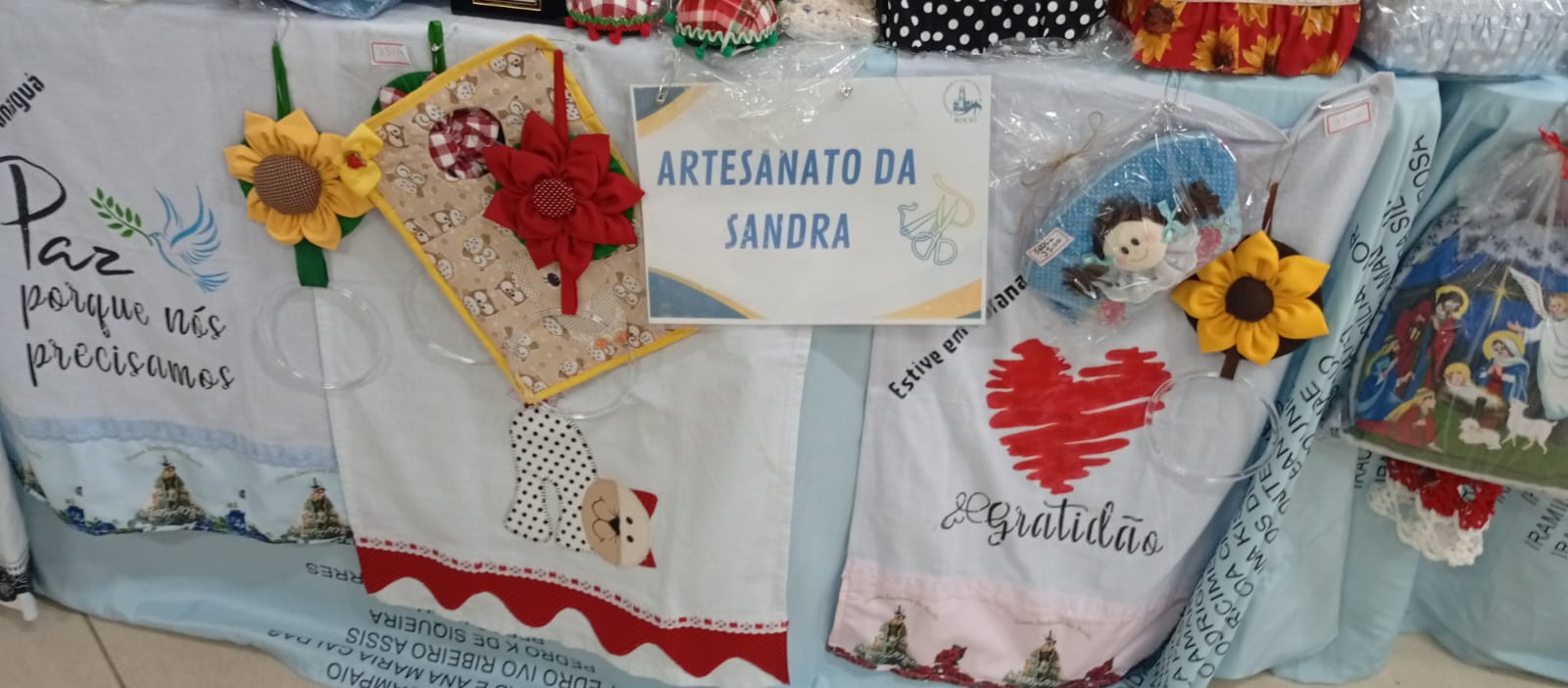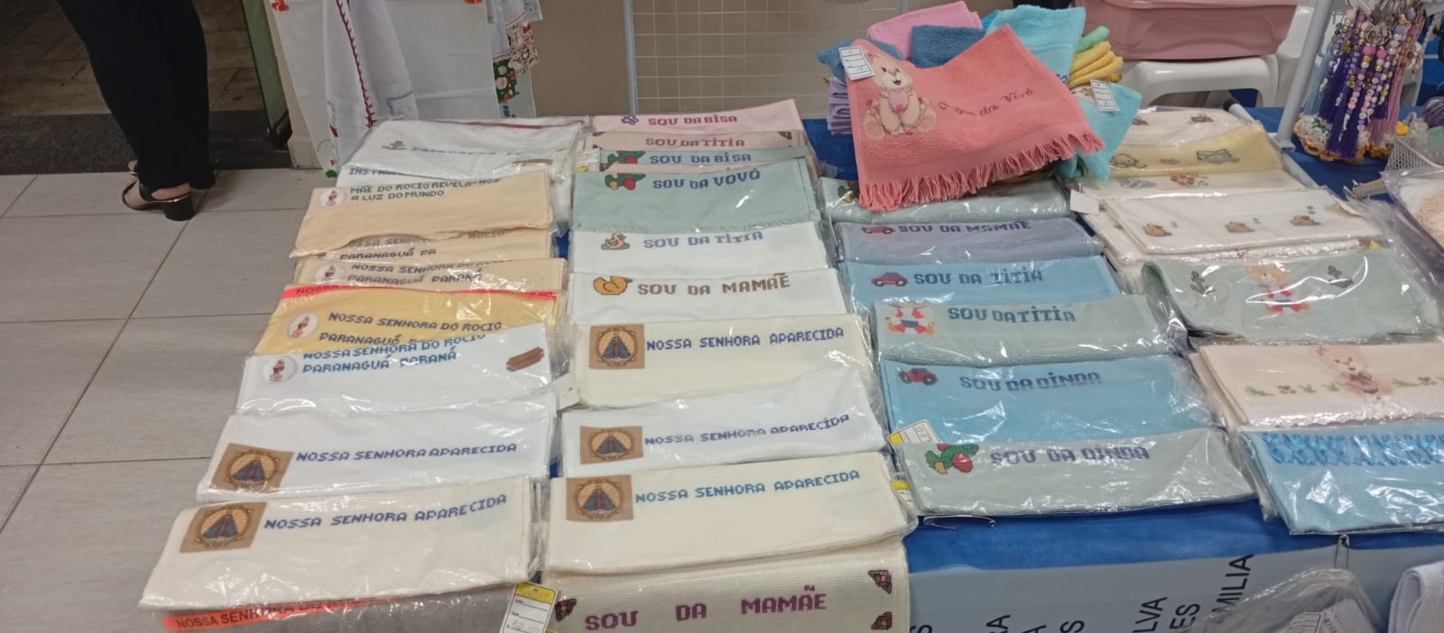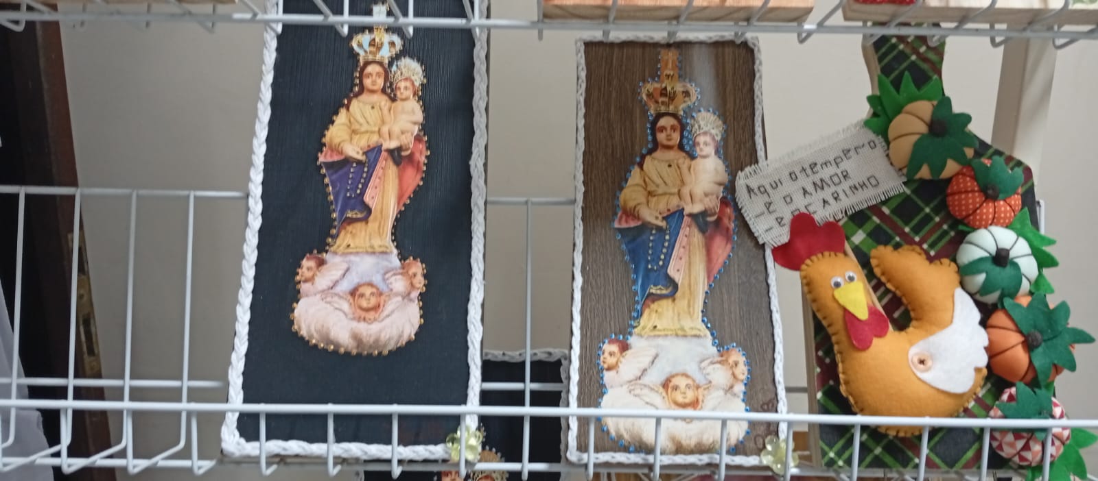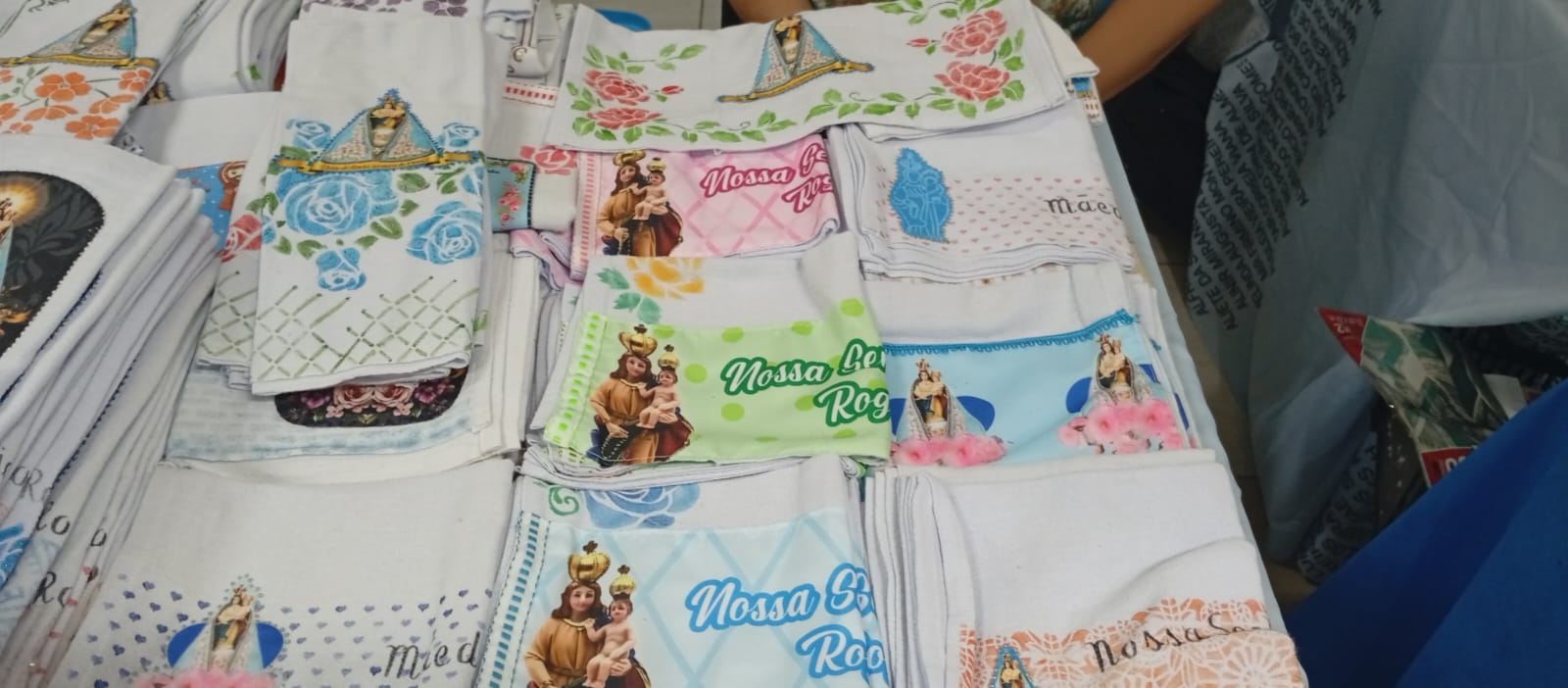 Entre os produtos disponíveis estão panos de copa e de praia com a imagem de Nossa Senhora do Rocio, quadros decorativos, tapetes e outros itens confeccionados manualmente, com preços que variam de R$ 10 a R$ 50.
