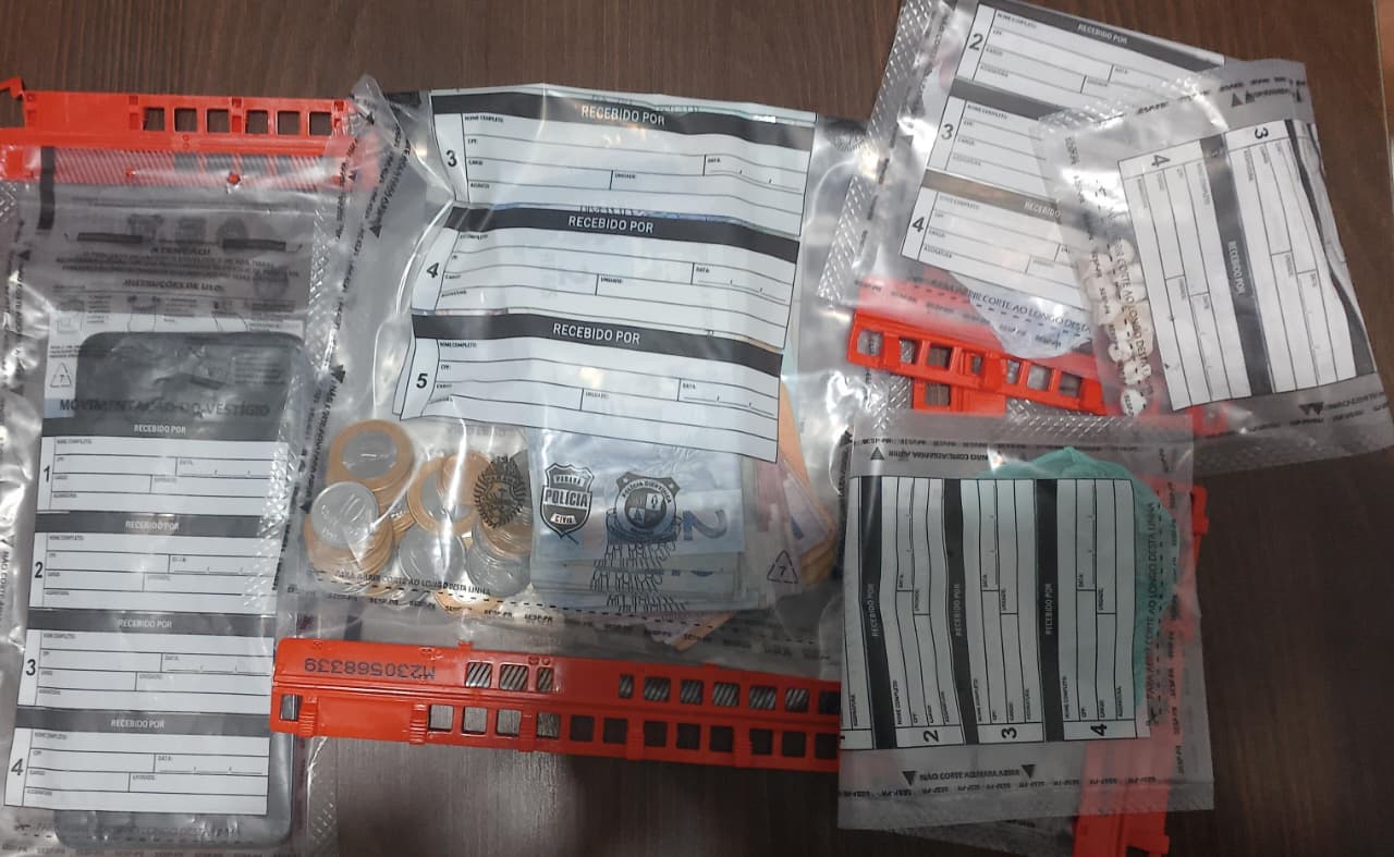 Na sequência, os policiais verificaram uma mochila que estava próxima ao abordado e que, segundo ele, era de sua propriedade. No interior, foram encontrados R$ 822,00 em cédulas e R$ 15,15 em moedas, quantia considerada característica do comércio de drogas.