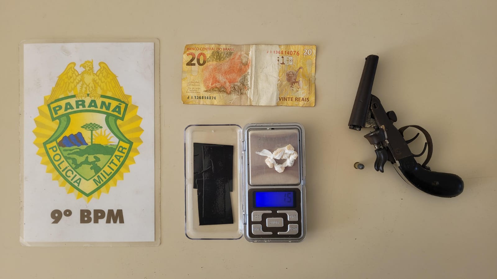 Na revista pessoal, os policiais encontraram dentro da pochete oito pedras de crack (1,4 g) e a quantia de R$ 20 em dinheiro. Em seguida, foi localizada a arma descartada pelo suspeito: uma garrucha calibre .32, da marca Rossi, carregada com uma munição no cano.