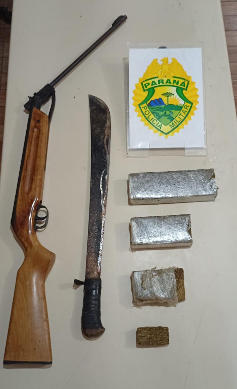 Durante as buscas na casa, foram encontrados 863 gramas de maconha. Em outro terreno da vítima, havia mais 277 gramas da droga, totalizando 1,140 quilo de entorpecente, além de uma espingarda de pressão e um facão usados para ameaças.
