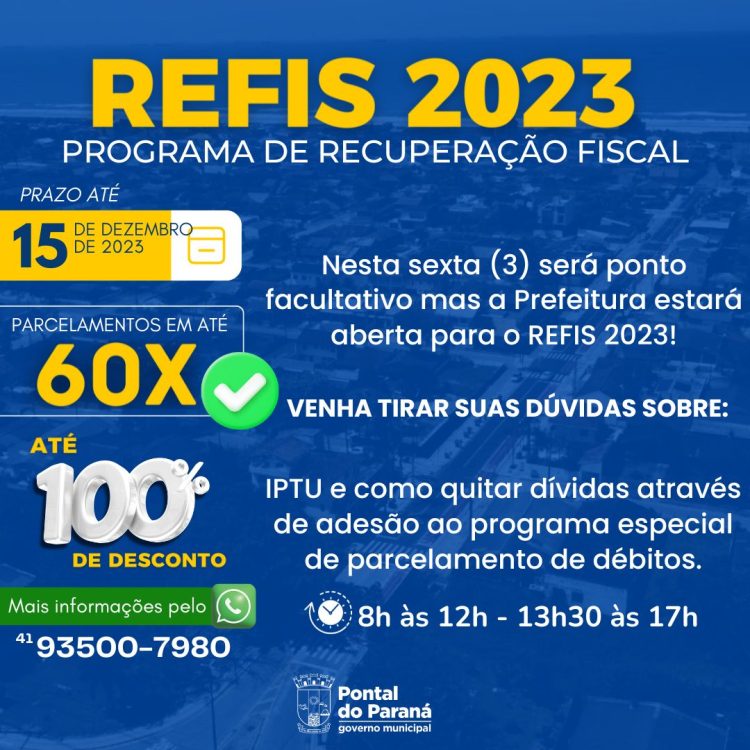 PONTAL DO PARANÁ – A Prefeitura de Pontal do Paraná abre nesta sexta-feira (3), até às 17h, atendimentos para contribuintes que buscam renegociar dívidas de Imposto Predial Territorial Urbano (IPTU) e outros débitos incluídos no Refis 2023.