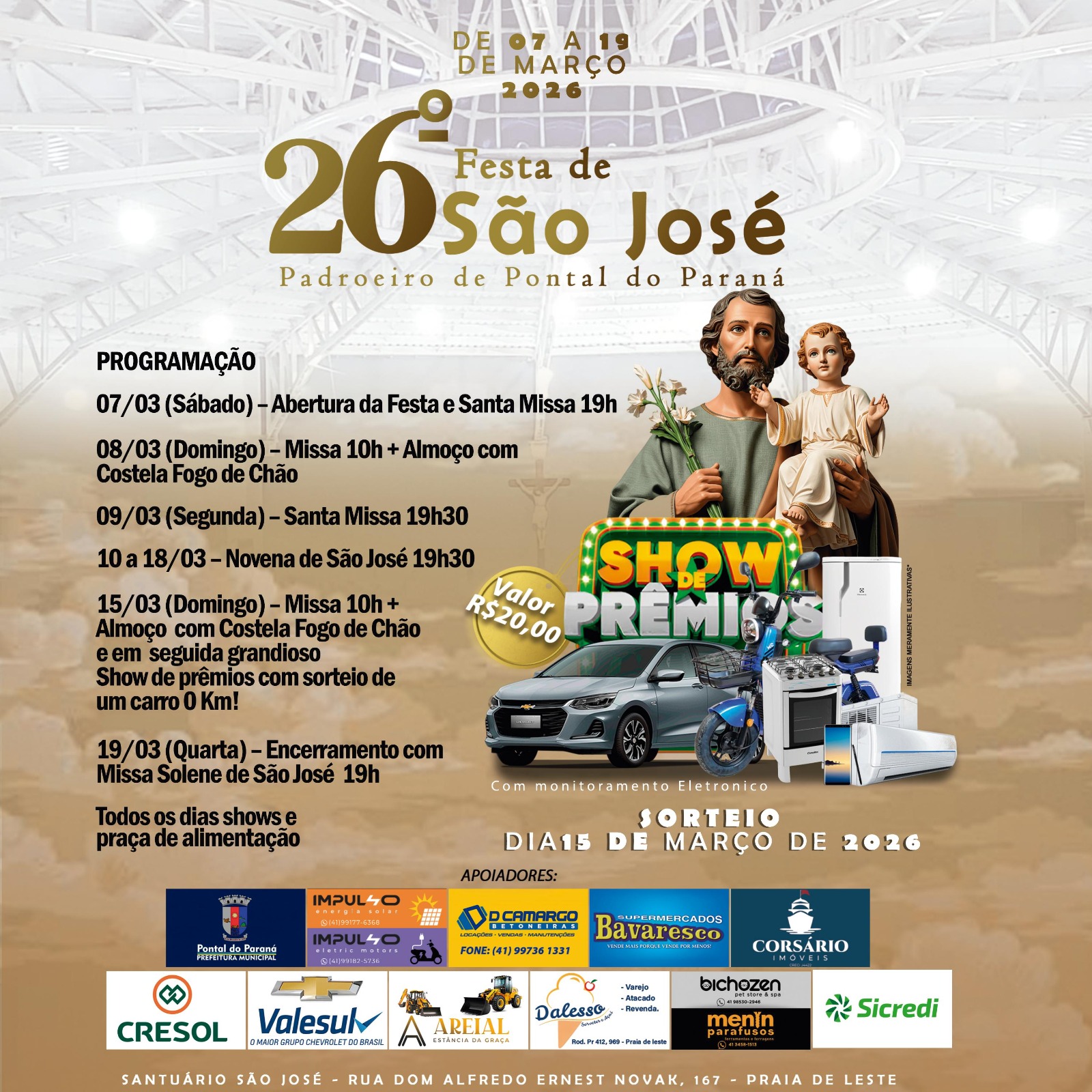 A Paróquia Santuário São José promove, entre os dias 7 e 19 de março, a tradicional Festa de São José, padroeiro de Pontal do Paraná. A programação inclui missas, novenas, apresentações culturais, shows gratuitos, praça de alimentação, corrida, cavalgada e o aguardado show de prêmios.