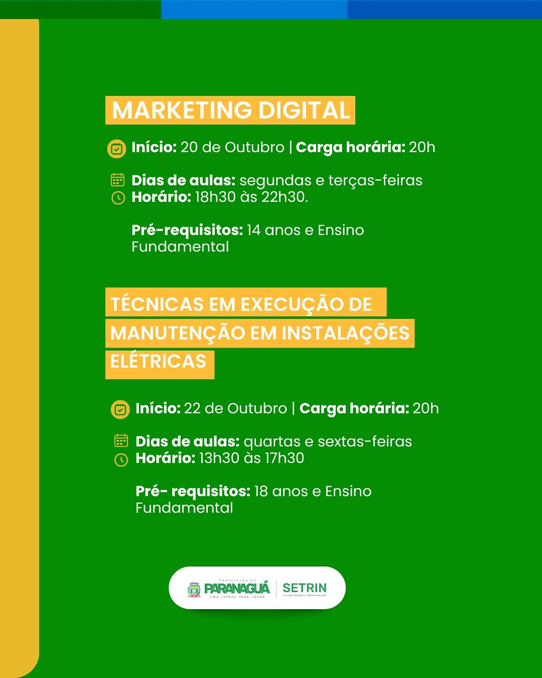 A Prefeitura de Paranaguá, por meio da Secretaria de Trabalho, Indústria e Comércio (SETRIN), está com inscrições abertas para novas turmas de cursos gratuitos voltados à qualificação profissional. As formações abrangem diferentes áreas e têm início ainda neste mês de outubro, oferecendo oportunidades para jovens e adultos que desejam aprimorar seus conhecimentos e ampliar as chances no mercado de trabalho.