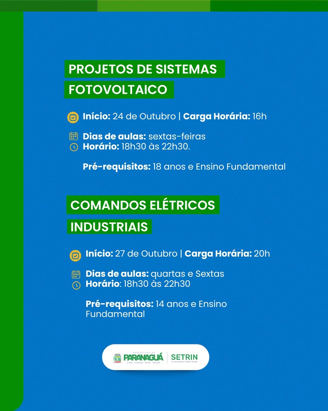 Os cursos são totalmente gratuitos e visam fortalecer a capacitação da população parnanguara, promovendo o acesso a novas oportunidades de renda e emprego.