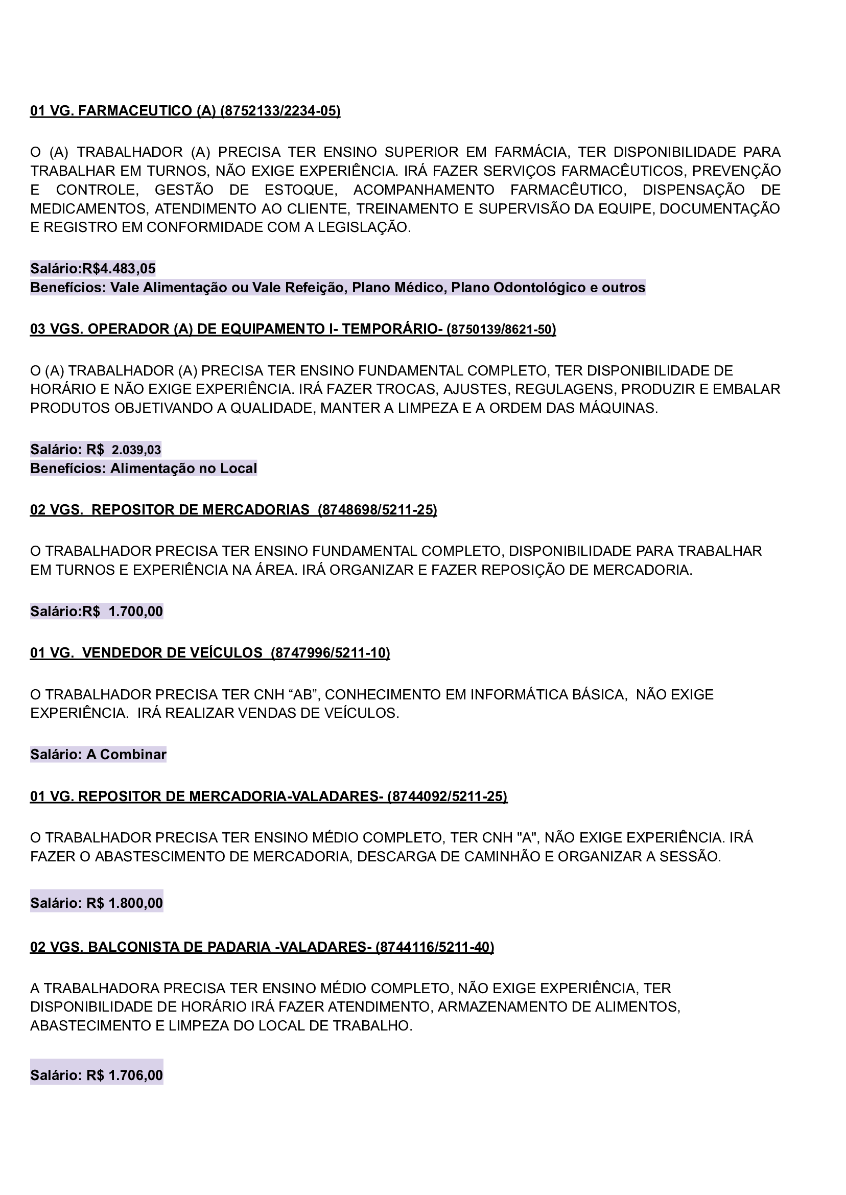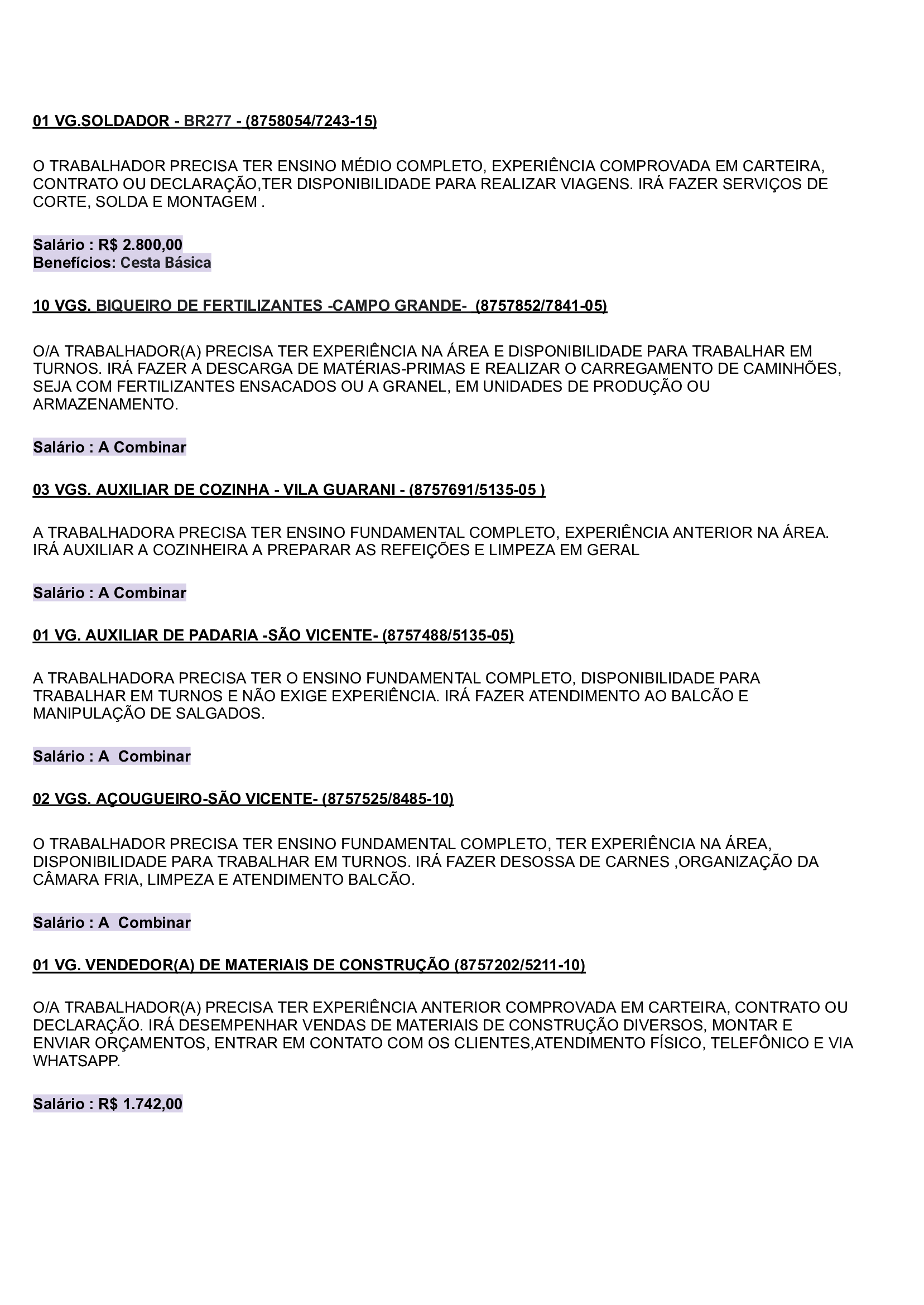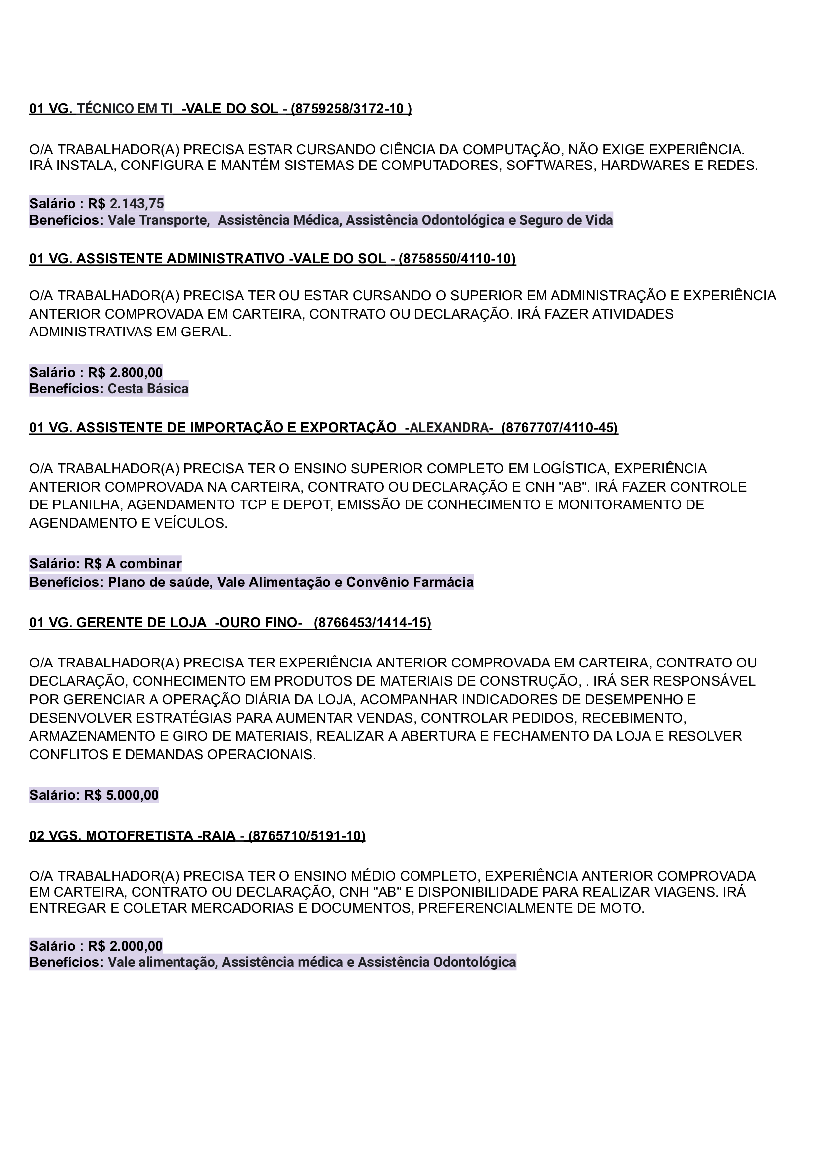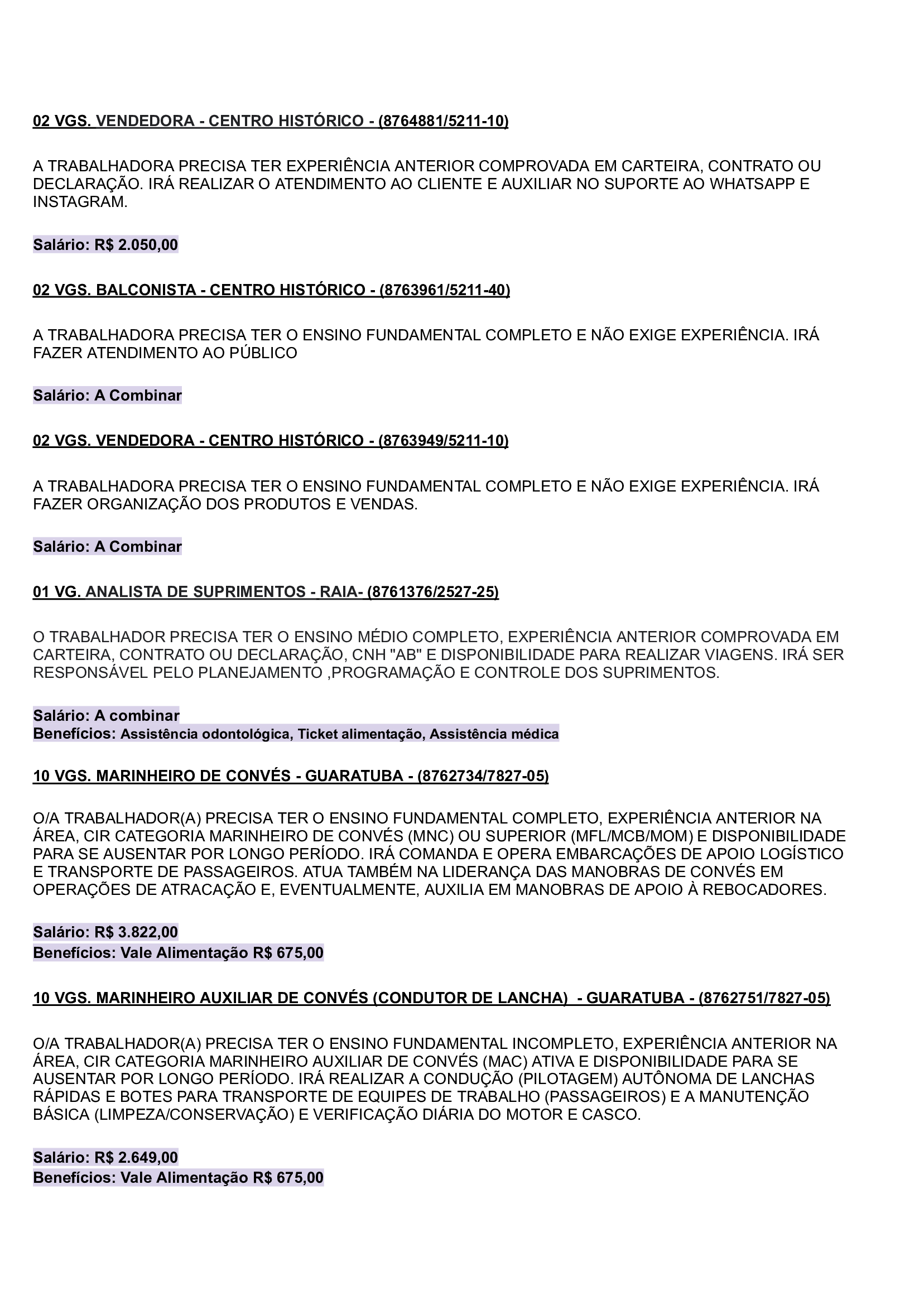 As vagas são variadas e os salários podem chegar até R$5.000,00. Neste inicio de semana contém oportunidades para o ramo de comércio em geral, indústrias, empresas portuárias, ramo de alimentação, supermercados…