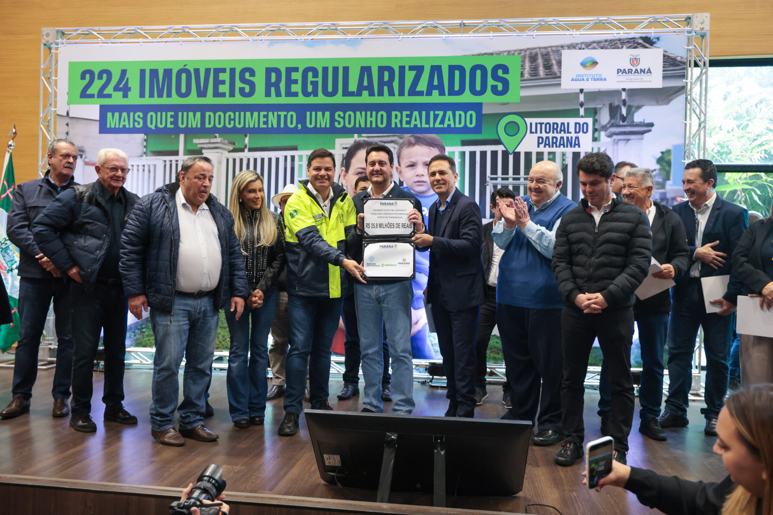 A assinatura do convênio ocorreu durante a solenidade de entrega de 212 títulos de propriedade rural no município, com investimento de R$ 455 mil do governo estadual, beneficiando famílias de Paranaguá, Pontal do Paraná e Antonina.