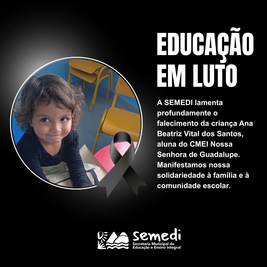 A Secretaria Municipal de Educação e Ensino Integral (SEMEDI) divulgou uma nota oficial lamentando o falecimento da aluna do CMEI Nossa Senhora de Guadalupe. No comunicado, a pasta manifestou solidariedade à família, servidores e toda a comunidade escolar, destacando o luto na rede municipal de ensino pela perda da criança.