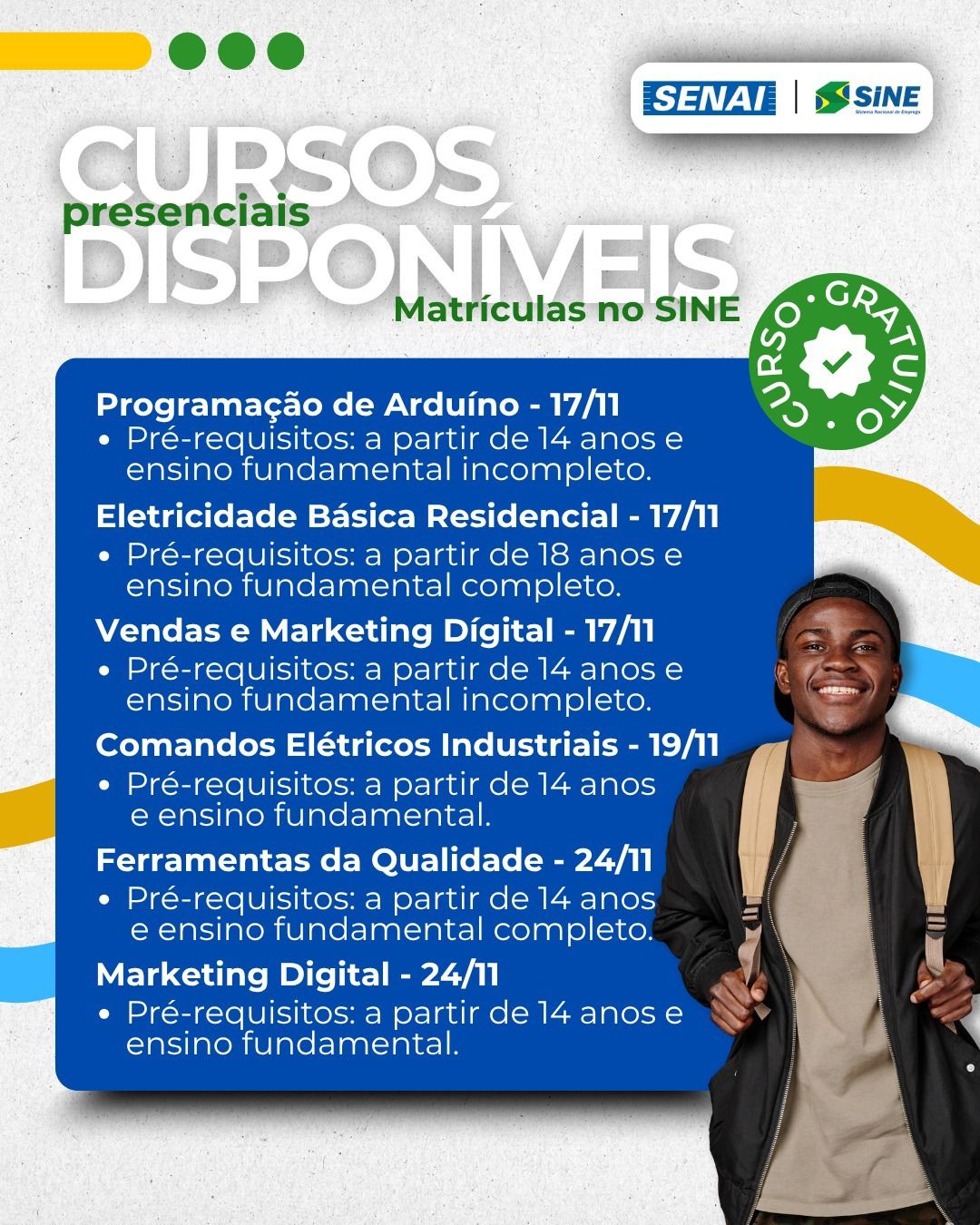 O SINE, em parceria com o SENAI, está com inscrições abertas para uma nova rodada de cursos presenciais gratuitos de qualificação profissional. A iniciativa busca ampliar as oportunidades de capacitação e inserção no mercado de trabalho para jovens e adultos do município.
