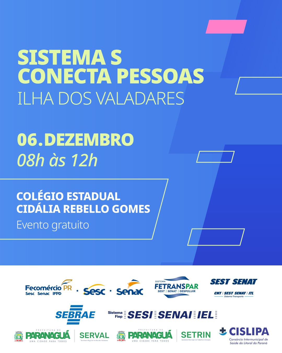 A comunidade da Ilha dos Valadares, em Paranaguá, receberá neste sábado (6) uma grande ação social promovida pelas entidades do Sistema S em parceria com instituições regionais. O evento, totalmente gratuito, acontece das 8h às 12h, no Colégio Estadual Cidália Rebello Gomes.