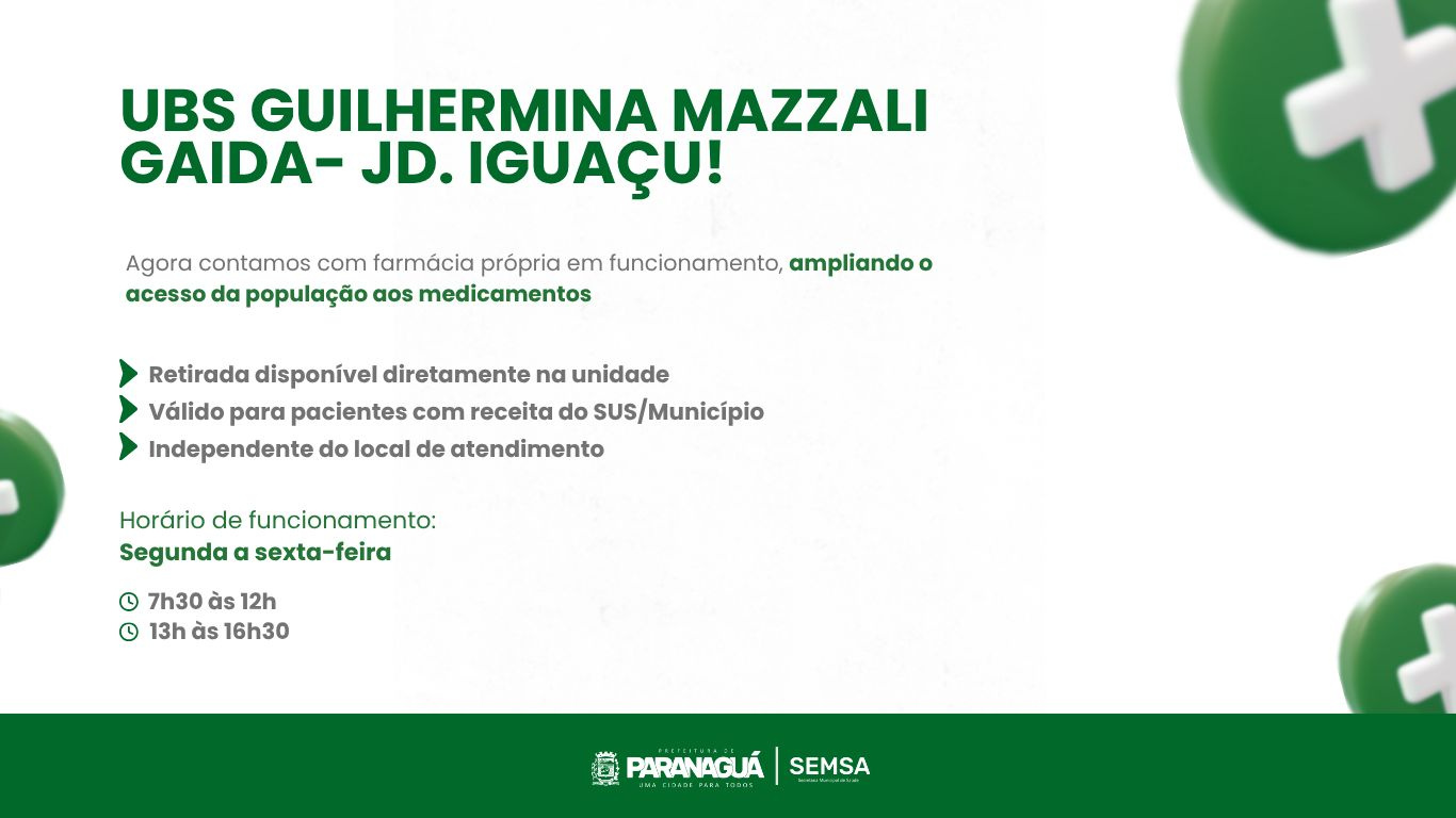 A Unidade Básica de Saúde (UBS) Guilhermina Mazzali Gaida, localizada no Jardim Iguaçu, passou a contar com uma farmácia própria em funcionamento a partir desta semana. A novidade amplia o acesso da população aos medicamentos e traz mais comodidade aos pacientes atendidos pela rede pública.